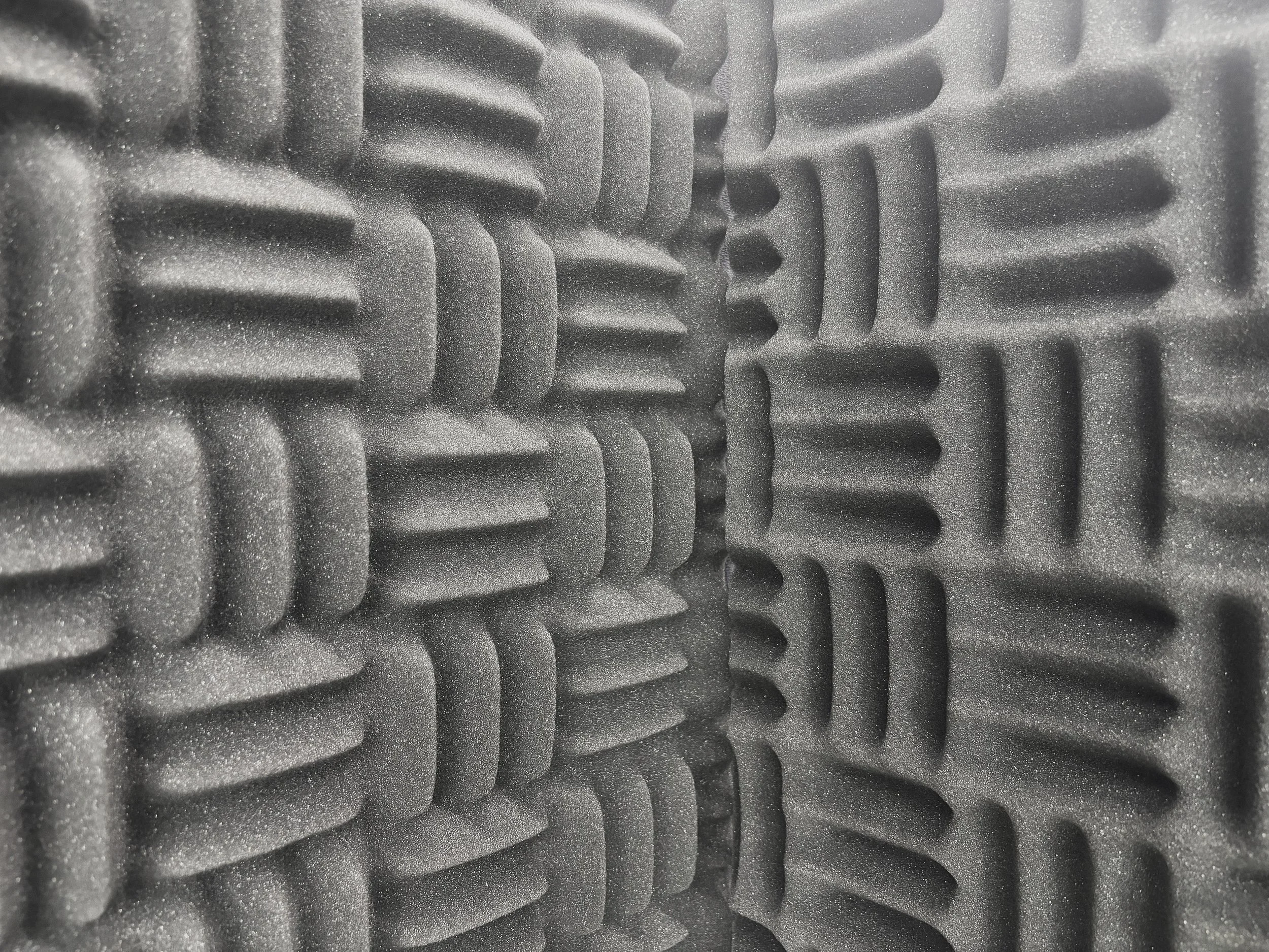 Acoustic foam tiles cut in an anechoic wedge pattern to absorb sound waves.